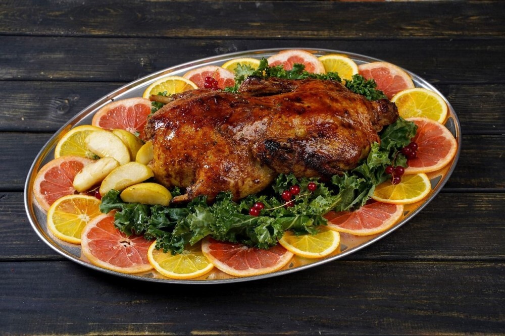 Утка, фаршированная яблоками и приготовленная в утятнице целиком. Цена за 1 кг. Выход готового блюда около 2 кг.