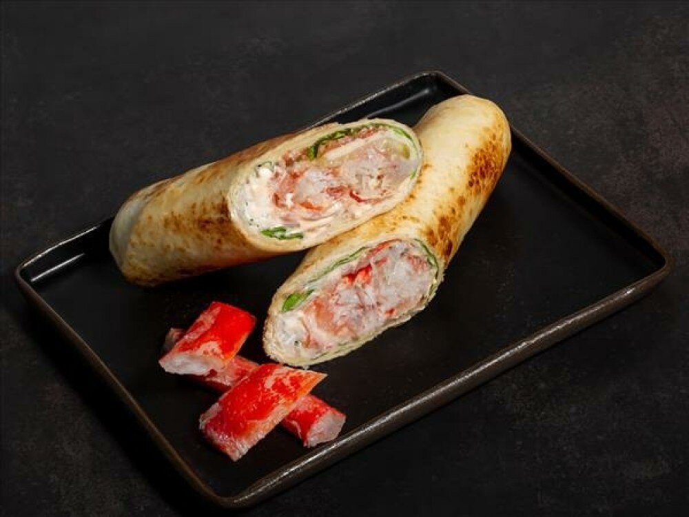 Мясо краба натуральное, тонкий лаваш, салат айсберг, помидор свежий, огурец соленый, соус руй