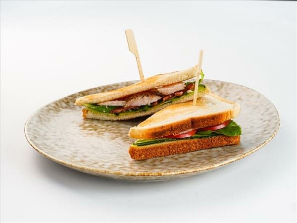 Хлеб тостовый, филе цыпленка, огурец, томат, соус цезарь, салат романо