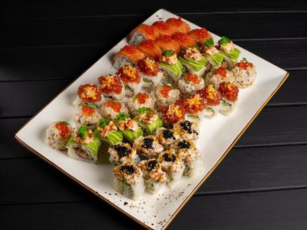 Роллы 40шт: Филадельфия, С тунцом огурцом авокадо и манго, Гребешок с лососем в трюфельном соусе, Ролл с крабом, Ролл с креветкой в трюфельном соусе