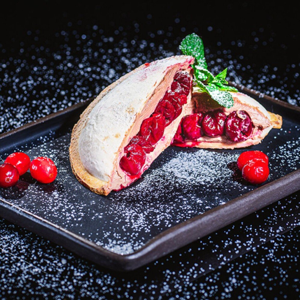 Уваренная в сахарном сиропе вишня со сливочным сырным кремом
