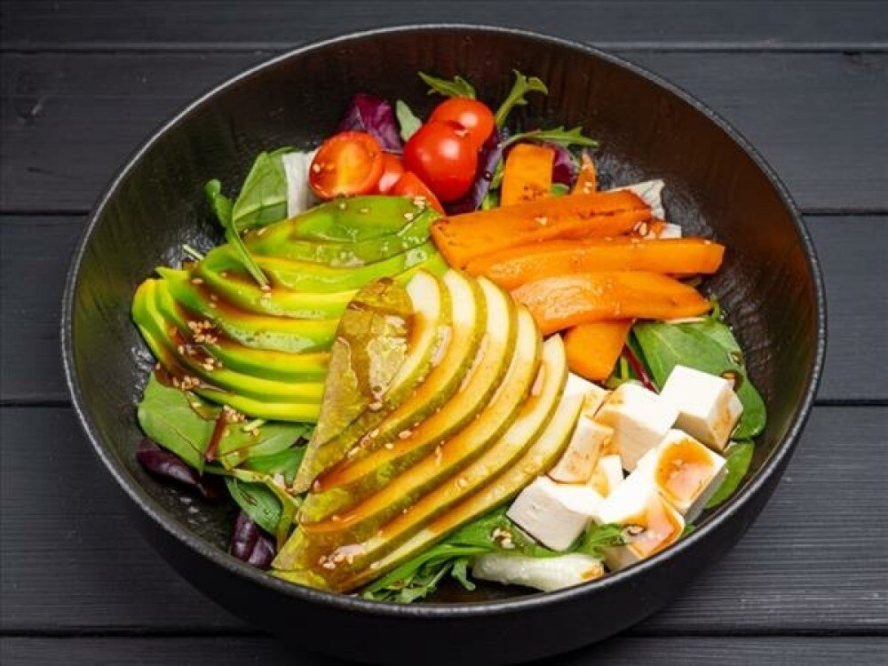 Микс-салат, салат айсберг, авокадо, груша конференс, сыр тофу, палочки из батата, томаты черри, соус дрессинг