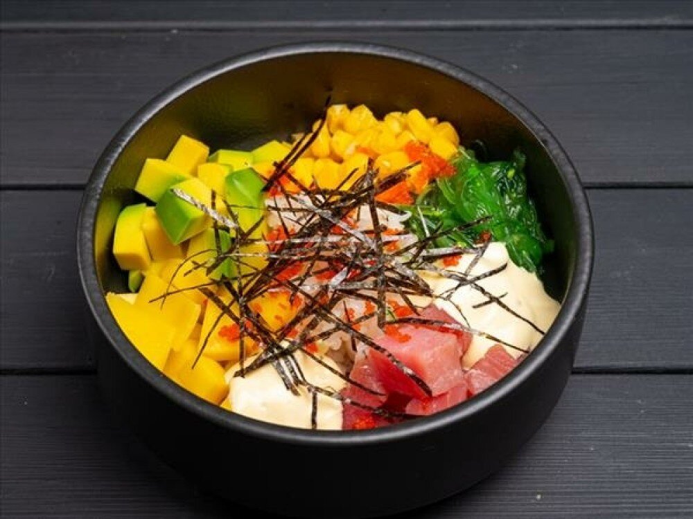 Тунец, чука, кукуруза, авокадо, манго, рис, тобико, нори