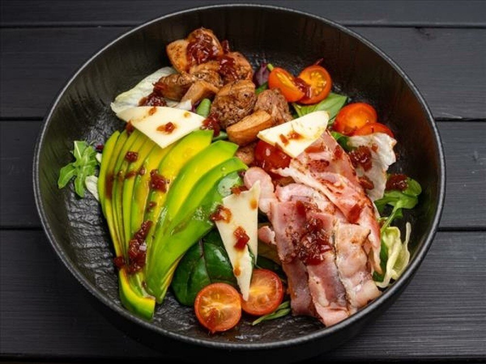 Микс-салат, салат айсберг, авокадо, бекон, бедро куриное, соус соевый, томаты черри , соус оливковый, пармезан